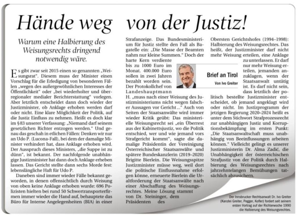In the Tiroler Tageszeitung of 17 May 2020 in the “Letter to Tyrol” our partner, lawyer Ivo Greiter, demanded the independence of public prosecutors from the Minister of Justice when it comes to bringing charges.
