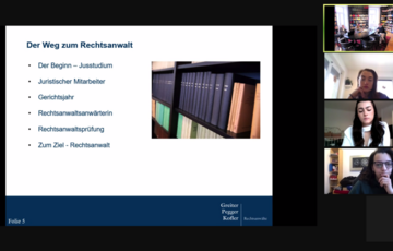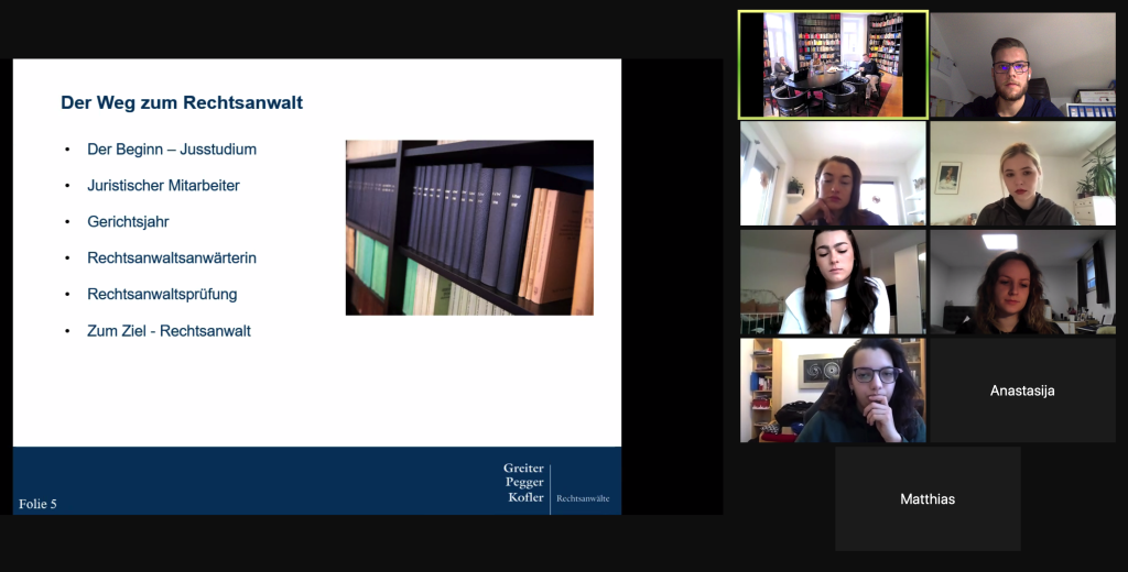 In Zusammenarbeit mit der ELSA – The European Law Students‘ Association – Innsbruck wurde am 30.11.2021 bereits zum zweiten Mal das „Breakfast@Law“ mit unserer Kanzlei als Gast- und Ratgeber organisiert. Rund 10 Studierende nahmen am „virtuellen Frühstückstisch“ Platz und freuten sich über die Gelegenheit, den „Weg zum Rechtsanwalt“ gemeinsam mit den RA Barbara Egger-Russe und Andrea Pegger sowie dem juristischen Mitarbeiter Hannes Frei näher kennenzulernen, zu hinterfragen und zu diskutieren. Die persönlichen Erfahrungsberichte und individuellen Tipps von unseren Kanzlei-Partnern und künftigen Juristen ermöglichen authentische Einblicke in die Ausbildungs- und Berufspraxis und sind damit wertvolle Entscheidungshilfen für angehende Rechtsanwälte oder an diesem Berufsbild interessierte Studierende.