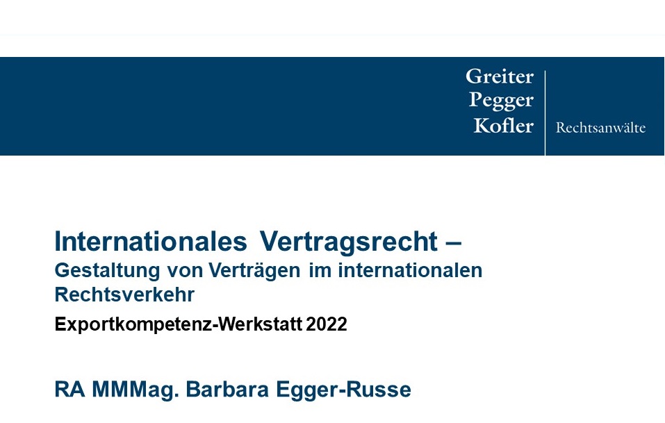 Am 20.04.2022 hat auch unsere RA Barbara Egger-Russe das Programm mit ihrem Vortrag zum Internationalen Vertragsrecht bereichert und die – wie schon in der Vergangenheit sehr zahlreichen – Teilnehmer:innen in die Gestaltung von Verträgen im internationalen Geschäftsverkehr eingeführt. Ein informationsreicher Tag für alle Teilnehmenden – und für Greiter Pegger Kofler & Partner stets aufs Neue eine interessante Erfahrung im Austausch mit Erst- und Neuexporteuren!