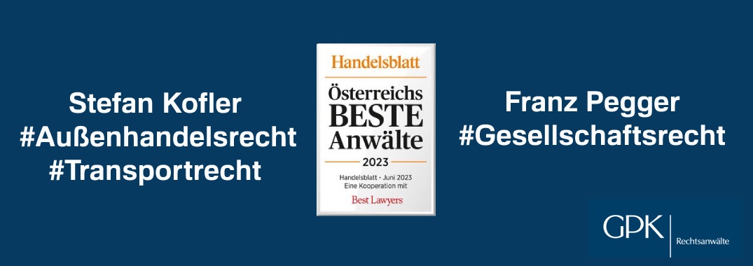 Das deutsche Handelsblatt hat in Kooperation mit dem US-Fachverlag „Best Lawyers“ erneut RA Franz Pegger im Gesellschaftsrecht sowie RA Stefan Kofler im Außenhandelsrecht und Transportrecht als „Österreichs beste Anwälte“ ausgezeichnet.