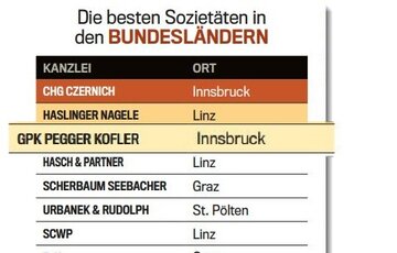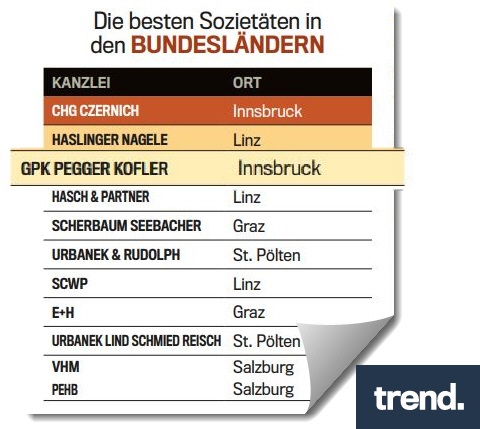 GPK Pegger Kofler & Partner freut sich beim diesjährigen Anwaltsranking im österreichischen Wirtschaftsmagazin trend. zum 15. Mal in Folge über eine TOP-3-Platzierung in der Kategorie „Beste Sozietäten in den Bundesländern außerhalb von Wien“.