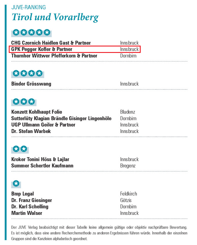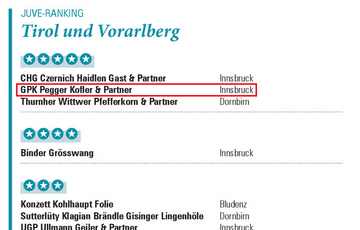 Laut aktuellem Ranking des JUVE-Magazins erreicht unsere Kanzlei GPK Pegger Kofler & Partner mit 5/5 Sternen erneut die Höchstwertung als eine der Top 3 Anwaltskanzleien in Tirol und Vorarlberg.