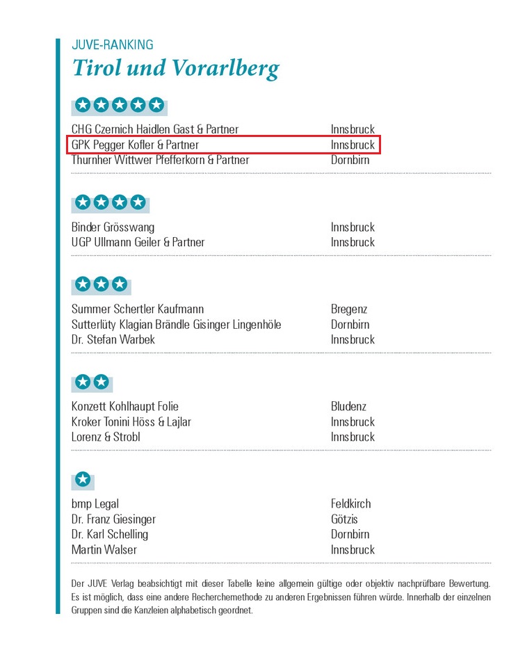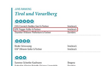 GPK Pegger Kofler & Partner behauptet im JUVE-Ranking 2025 erneut seine führende Position im österreichischen Rechtssektor. Mit der Höchstwertung von 5/5 Sternen in der Kategorie Tirol und Vorarlberg würdigt das Fachmagazin unsere Kanzlei damit als eine der bestbewerteten Wirtschaftskanzleien dieser Region.
