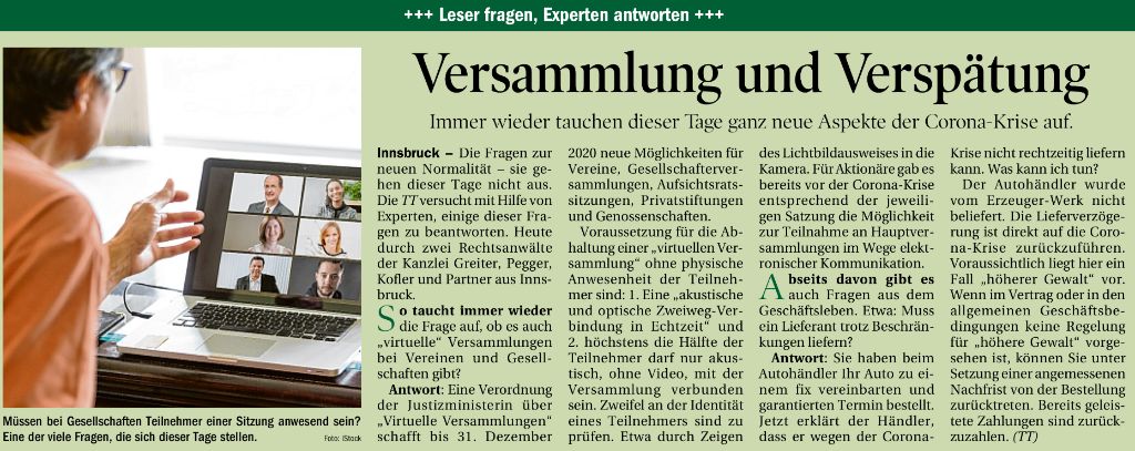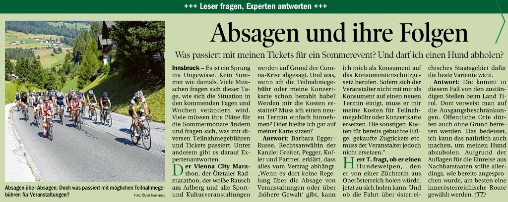 Unsere Rechtsanwälte beantworten rechtliche Fragen von Lesern der Tiroler Tageszeitung im Zusammenhang mit der Corona-Krise.